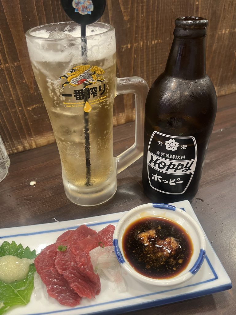 帰り道、新宿の居酒屋で、ホッピーと馬刺し、焼き鳥。