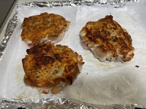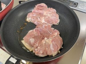 モモ肉の片側 皮目だけを低温で焦げ目がつくまでじっくり焼きます。