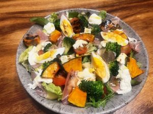 生ハム、モッツァレラ、玉子、カボチャ、アヴォカド、ブロッコリー、ミニトマト、キウイ、リンゴのサラダ