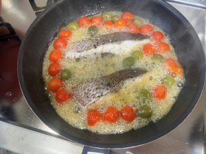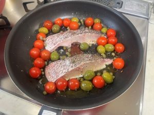 真鯛の切り身を、生オリーブ、ミニトマト、ケイパーと一緒にアサリの出し汁で蒸し焼きにします。