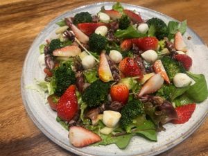 ホタルイカ、イチゴ、モッツアレラ、ブロッコリー、ミニトマト、リンゴのサラダ