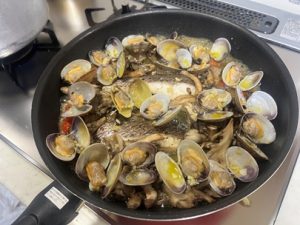 アサリは煮すぎると身が小さくなってしまうので、ワイン蒸しにして別にしておきます。