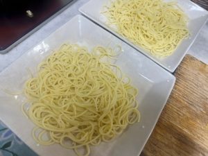 茹で上げのスパゲティをお皿に敷いて、その上にアクアパッツァを盛りつけます。