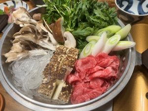 Sukiyaki is quick to prepare, and it feels like a treat, and it goes well with wine, which is really helpful.