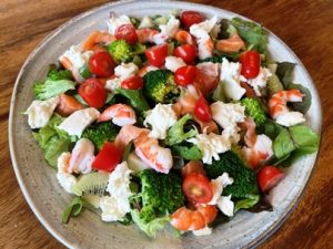 Salmon, Shrimp, Mozzarella, Cherry-tomatoes, Kiwi and Apple salad