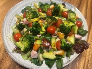 Salad with Chicken, Shrimp, Avocado, Broccoli, Cherry-tomatoes, Kiwi and Apples