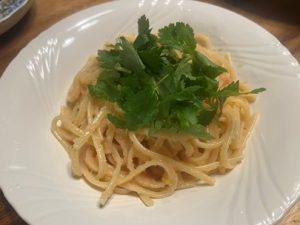 The pasta is linguine. The thick noodles were chewy and well mixed with the mentaiko sauce and were delicious.