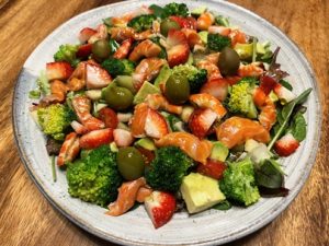 Salad with Strawberries, Salmon, Rose-shrimp, Avocado, Broccoli, Cherry-tomatoes, Kiwi and Apples