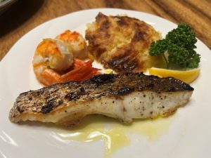Grilled red snapper, sauteed shrimp, and potato gratin