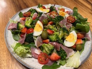 Salad with prosciutto, egg, strawberries, kiwi, apple, broccoli, cherry tomatoes and olives