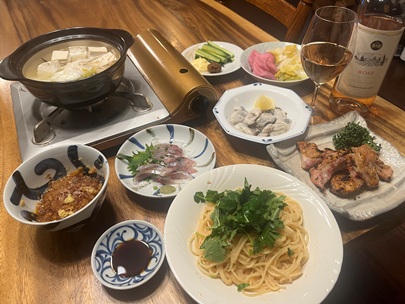 肉野菜炒め、鮭のワイン蒸し、やきとり、けんちん汁、ご飯、ノンアルコールビール