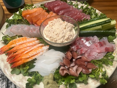 キハダマグロ、コチ、ホタルイカ、真鯛、ヤリイカ、寿司エビ、サーモン、ツナマヨ、キュウリ
